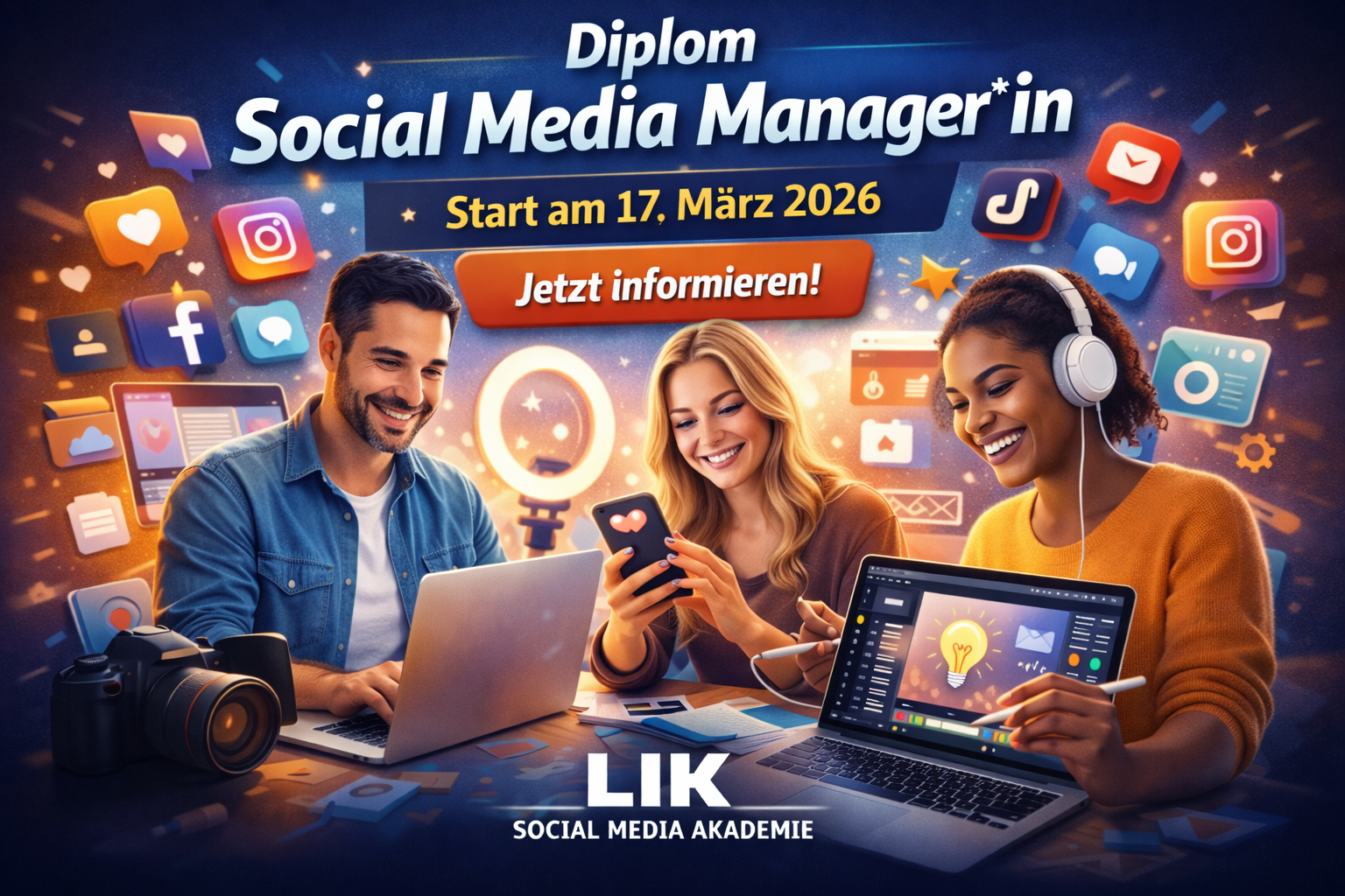 Die digitale Kommunikation verändert heute, wie Unternehmen Sichtbarkeit und Erfolg erzeugen. Social Media ist dabei mehr als ein Trend – es ist ein professionelles Berufsfeld mit stetig wachsender Nachfrage nach Expert:innen. Der Diplomlehrgang „Social Media Manager*in“ der LIK Akademie bereitet dich praxisnah, strategisch und zukunftsorientiert auf diesen dynamischen Beruf vor.
